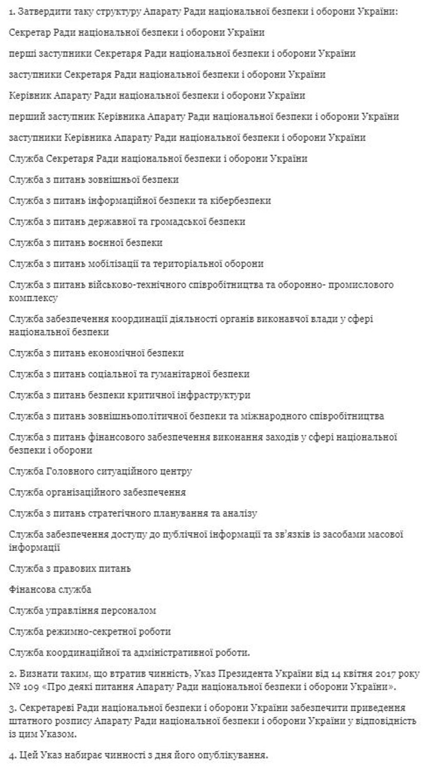 Указом №764/2019 президент постановив затвердити наступну структуру апарату РНБО (СКРІНШОТ):