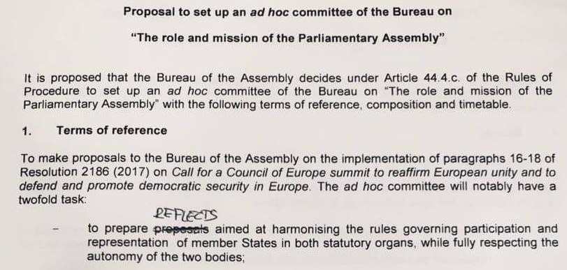 У документі йдеться про те, що група вивчатиме можливість виконання "параграфів 16-18 Резолюції №2186". Фактично ж йдеться про відновлення повноважень делегації Росії у ПАРЄ. Як відомо, повноваження росіян у асамблеї були обмежені від 2014 року через накладені на них санкції. (детальніше про дану резолюцію читайте в статті "Битва за гроші та за Росію: в Раді Європи запустили новий сценарій скасування санкцій")