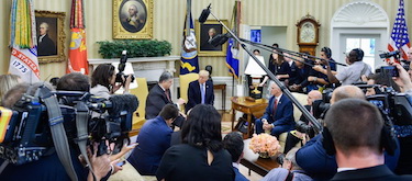 The meeting with Ukrainian President Petro Poroshenko was originally described by the White House as a brief "drop-in." But the two presidents posed for photographs in the Oval Office and made brief remarks following Poroshenko's more extensive meetings with Vice President Mike Pence and the administration's top national security advisers.
