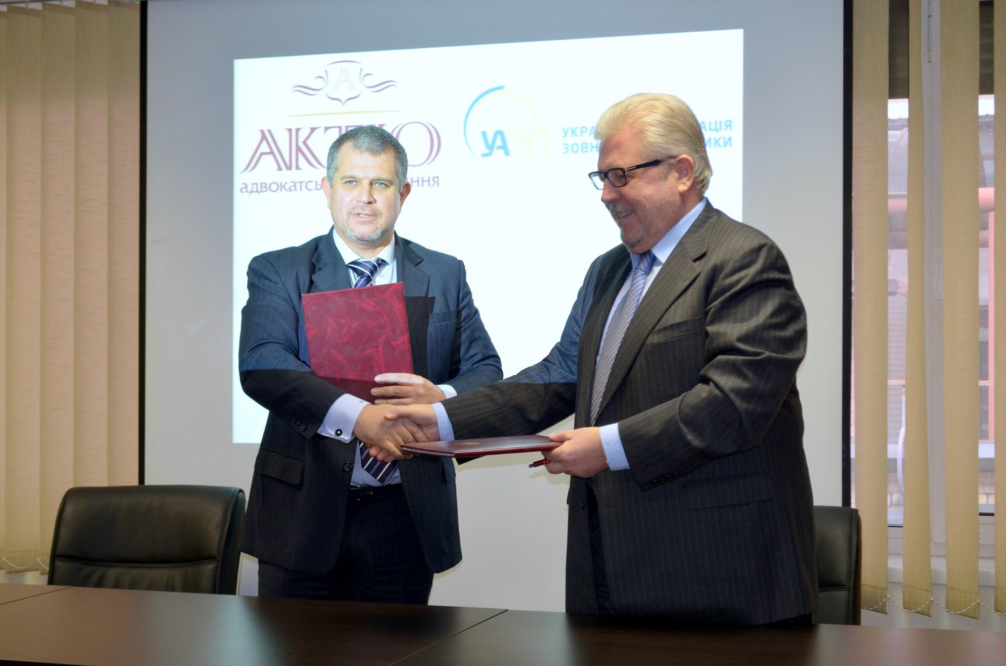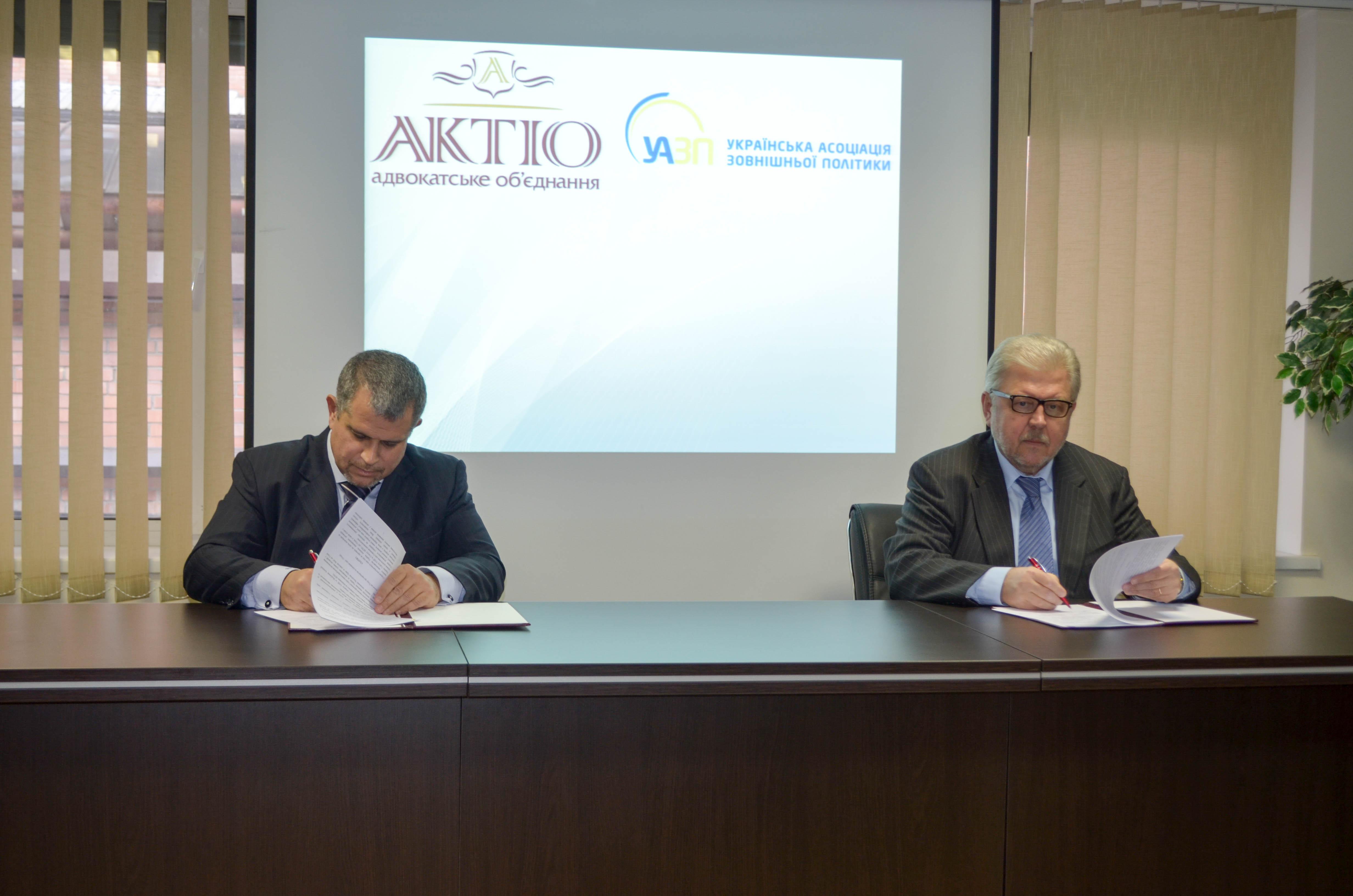 Угоду підписали Президент Української асоціації зовнішньої політики, Посол Володимир Хандогій та Директор Адвокатського об’єднання “Адвокатська фірма “АКТІО” Володимир Ямпольський.
