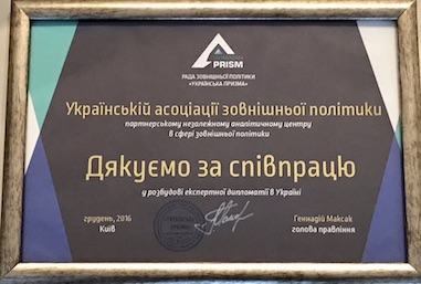 Уперше з часу створення у 2015 році Українська асоціація зовнішньої політики отримала високе експертне визнання за свою діяльність в активізації публічної̈ дипломатії̈, використанні інтелектуального ресурсу членів Асоціації̈ задля проведення незалежних досліджень з широкого кола питань міжнародного життя, а також аналізу та прогнозування глобальних та регіональних зовнішньополітичних процесів. Диплом за “внесок у розбудову експертної дипломатії в Україні” вручений УАЗП Радою зовнішньої політики “Українська призма".