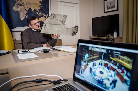 Міністр закордонних справ України Дмитро Кулеба провів онлайн-зустріч із главами МЗС країн G7, продемонстрував їм частину іранського безпілотника, наголосивши, що Іран має припинити постачання до РФ зброї, яка використовується для вбивства українців.