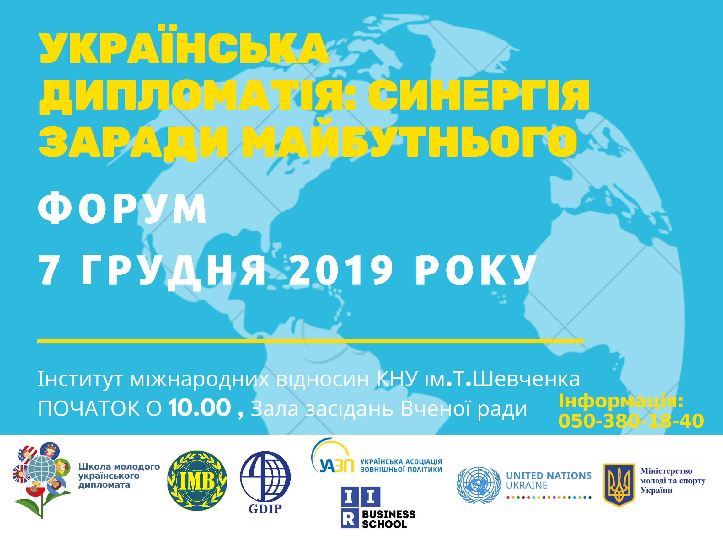Школа молодого українського дипломата Бізнес-школи Інституту міжнародних відносин Київського національного університету імені Тараса Шевченка запрошує на форум «УКРАЇНСЬКА ДИПЛОМАТІЯ: СИНЕРГІЯ ЗАРАДИ МАЙБУТНЬОГО», який відбудеться 7 грудня 2019 року в Інституті міжнародних відносин КНУ ім. Т.Шевченка за адресою вул. Іллєнка Ю. (колишня Мельникова) 36/1, Зала засідань Вченої Ради (3 поверх). ПОЧАТОК О 10.00.